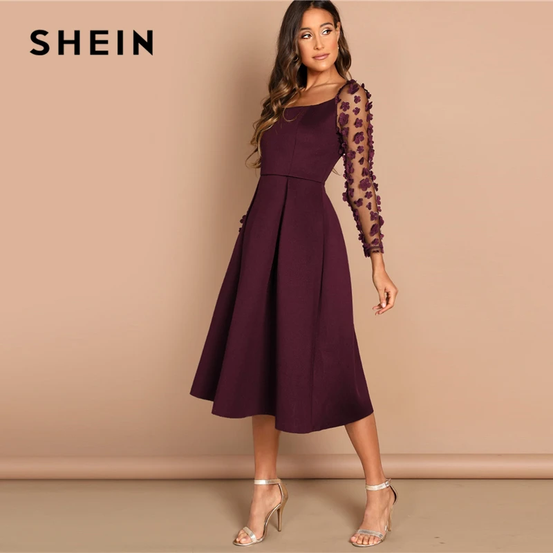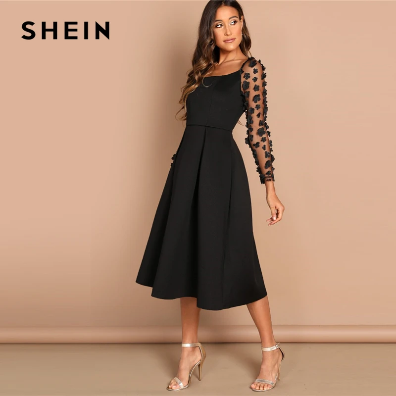 Special Offer SHEIN Night Out Contrast Mesh Applicaties Plisse Vierkante Hals Knie Lengte Jurk Herfst Moderne Lady Workwear Vrouwen Jurken Discount 40% Today!
