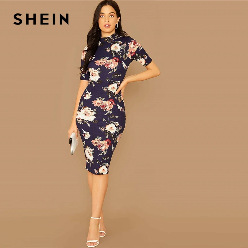 Special Offer SHEIN Navy Bloemenprint Stand Kraag Elegante Bodycon Jurk Vrouwen 2019 Herfst Korte Mouw Getailleerd Midi Potlood Jurken Discount 45% Today!