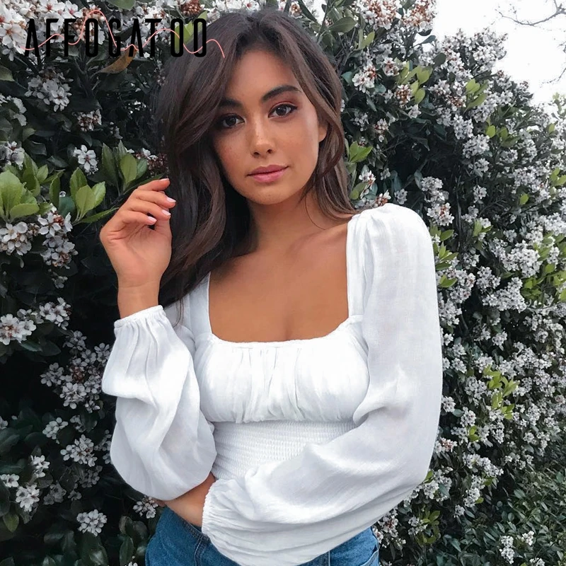 Special Offer Affogatoo Vintage vierkante kraag witte blouse vrouwelijke Ruches lange mouw vrouwen blouse shirt 2019 Zomer dames cropped peplum top Discount 47% Today!