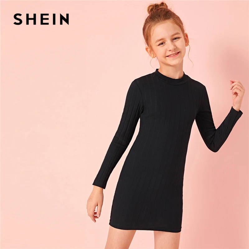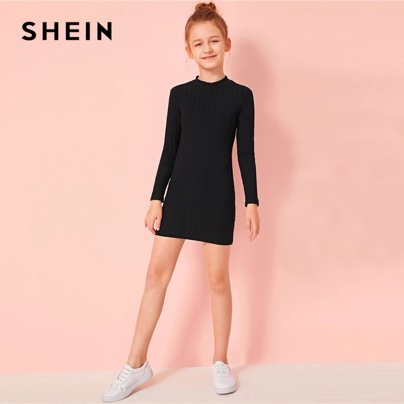 Special Offer SHEIN Kiddie Zwarte Stand Kraag Geribbelde gebreide Voorzien Meisjes Casual Kleding 2019 Herfst Lange Mouwen Elastische Kids Bodycon Mini Jurken Discount 40% Today!