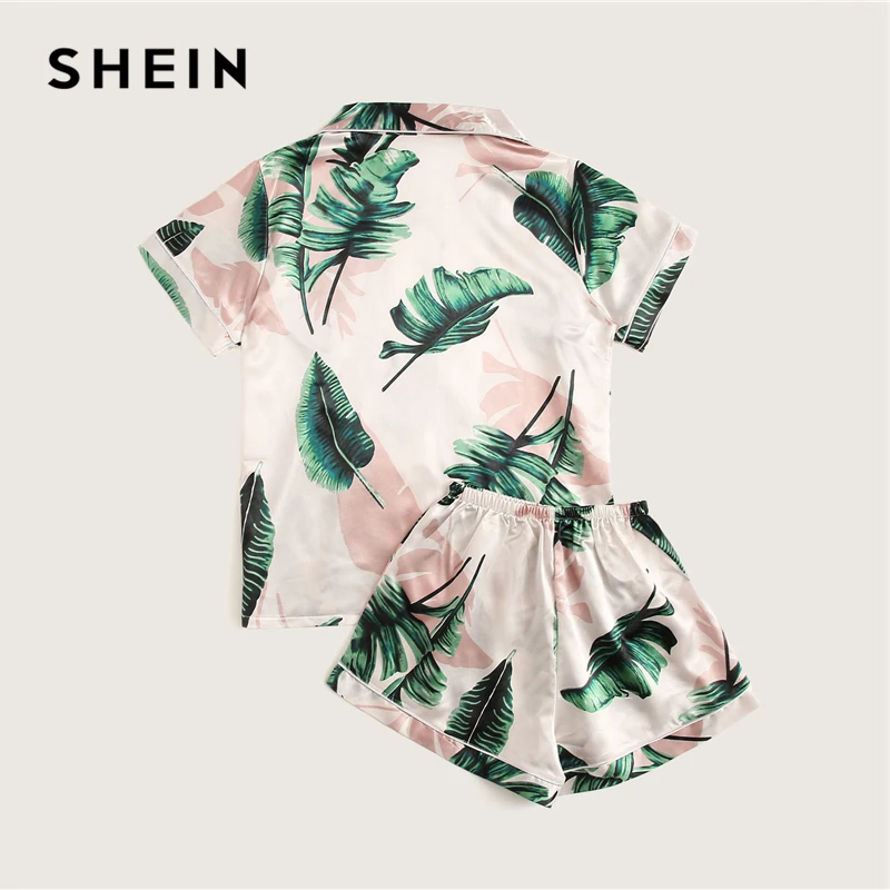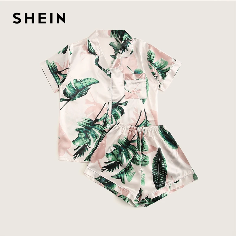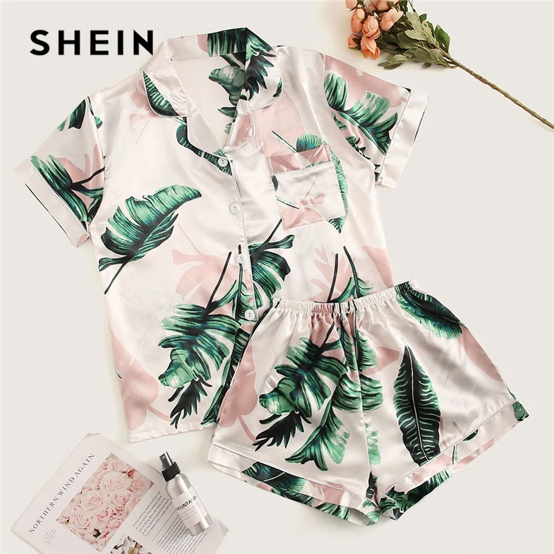 Special Offer SHEIN Tropische Print Satijn Pyjama Set Toevallige Slaap Slijtage Shorts Sets Korte Mouw Pocket Vrouwen Zomer Pyjama Set Discount 45% Today!