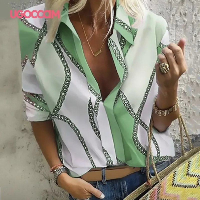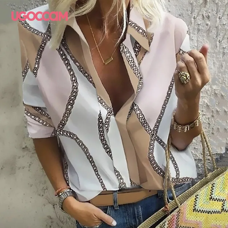 Special Offer Ugoccam Lange Mouw Blouse Vrouwen Print Turn Down Kraag Chiffon Blouse Elegante Werk Shirt Plus Size Tops Blusas Mujer de Moda Discount 48% Today!