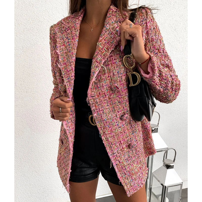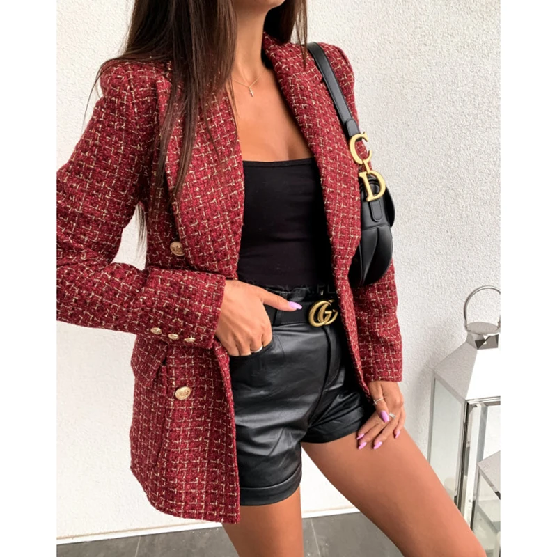 Special Offer Plaid tweed double breasted blazer vrouwen lange mouwen turn down kraag slim jas jas Elegante kantoor vrouwen blazers en jassen Discount 35% Today!