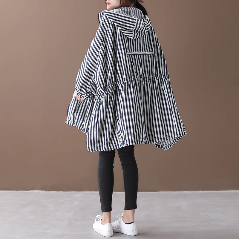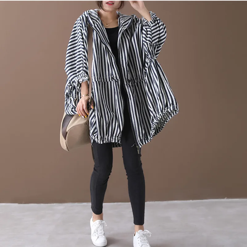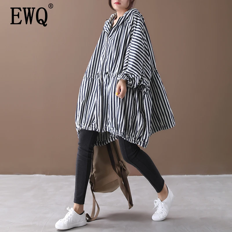 Special Offer [Ewq] 2020 Herfst Nieuwe Patroon Office Lady Stijl Volledige Mouw Losse Verticale Gestreepte Patroon Trekkoord Capuchon Kraag Jas AF889 Discount 44% Today!