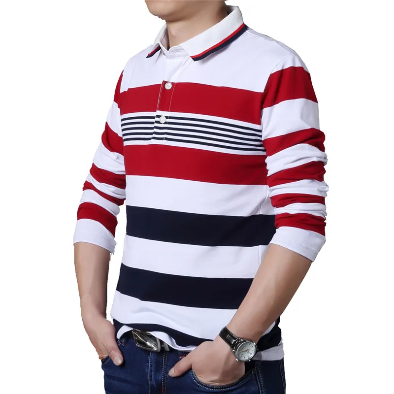Special Offer TFETTERS Herfst Casual Mannen T shirt Wit en Rode Streep Patroon Fitness Lange Mouwen Turn down Kraag Katoen Tops Streep kleding Discount 42% Today!