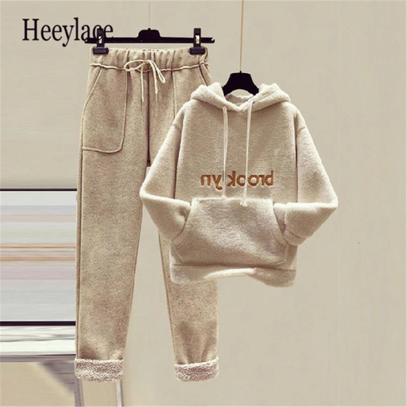 Special Offer Plus size vrouwen hooded top en broek set dames brief print pocket warm thicken trui sweatshirts en hoge taille warm set Discount 20% Today!