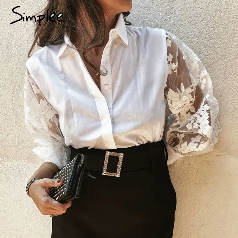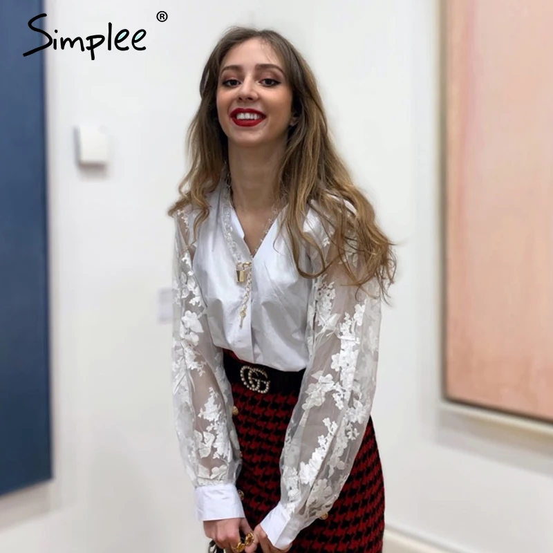 Special Offer Simplee Elegante Parel Mesh Blouse Shirt Vrouwen Bladerdeeg Mouw Vrouwelijke Witte Top Shirt Lente Wit Casual Party Wear Dames Werk tops Discount 40% Today!