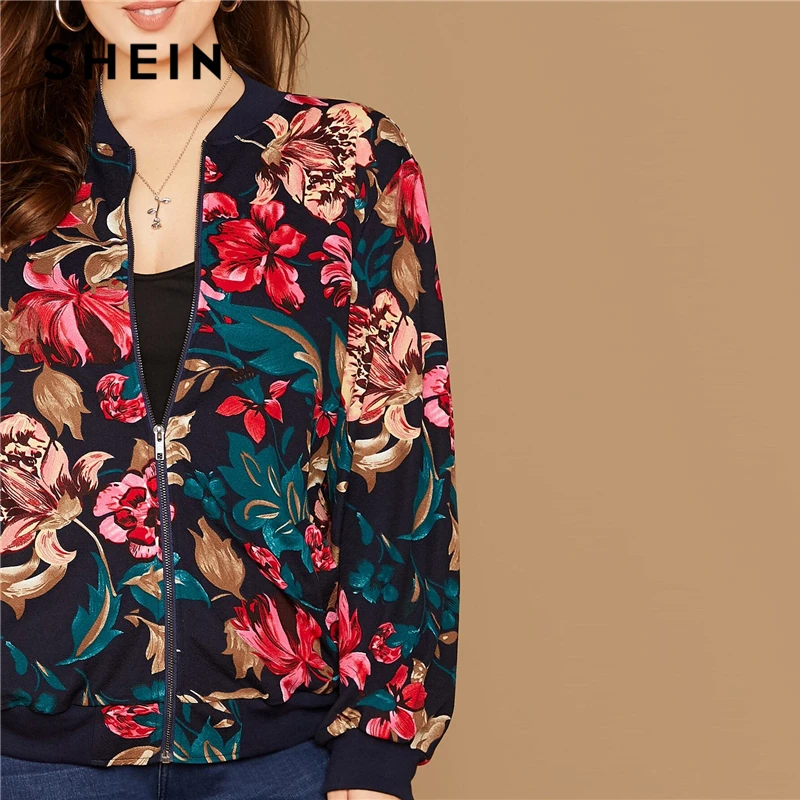 Special Offer SHEIN Plus Size Bloemenprint Rits Up Bomber Jas Vrouwen Herfst Lange Mouwen Staan Kraag Jas Leuke Uitloper Casual Plus jassen Discount 47% Today!