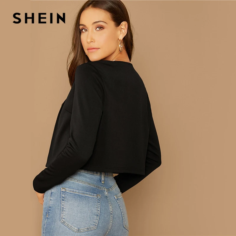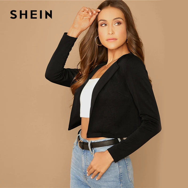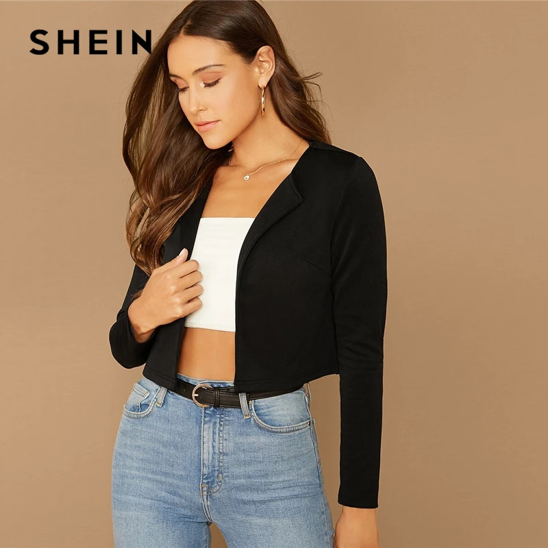 Special Offer SHEIN Zwart Effen Sjaal Kraag Crop Blazer Vrouwen Zomer Herfst Lange Mouw Elegante Uitloper Jassen Werkkleding Blazers Discount 45% Today!
