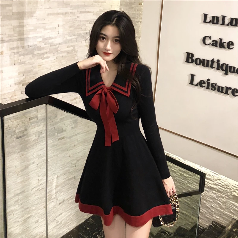 Special Offer Vrouwen Lente En Herfst Jurk Boog Nieuwe Gebreide Jurk Temperament Mini A lijn Sexy Jurk Zoete Lange Mouw Jurk Vrouwen GD243 Discount 39% Today!