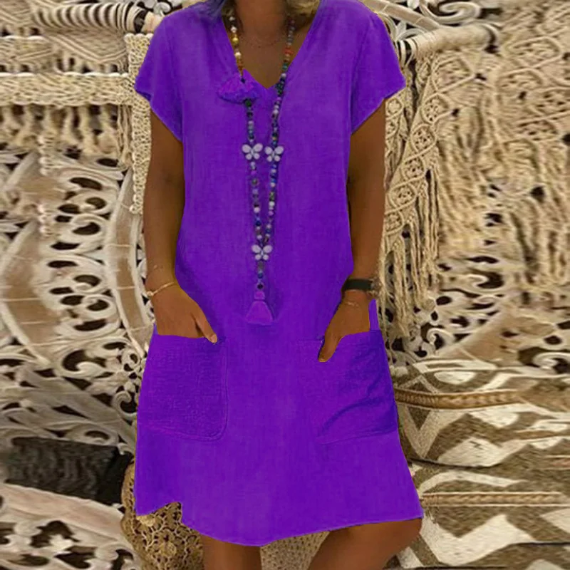 Special Offer Vrouwen Lange Shirt Katoen Linnen Jurk Korte Mouwen Zakken Vintage Jurk Dames Casual Losse Effen Vestidos Plus Size 5XL 6XL Discount 10% Today!