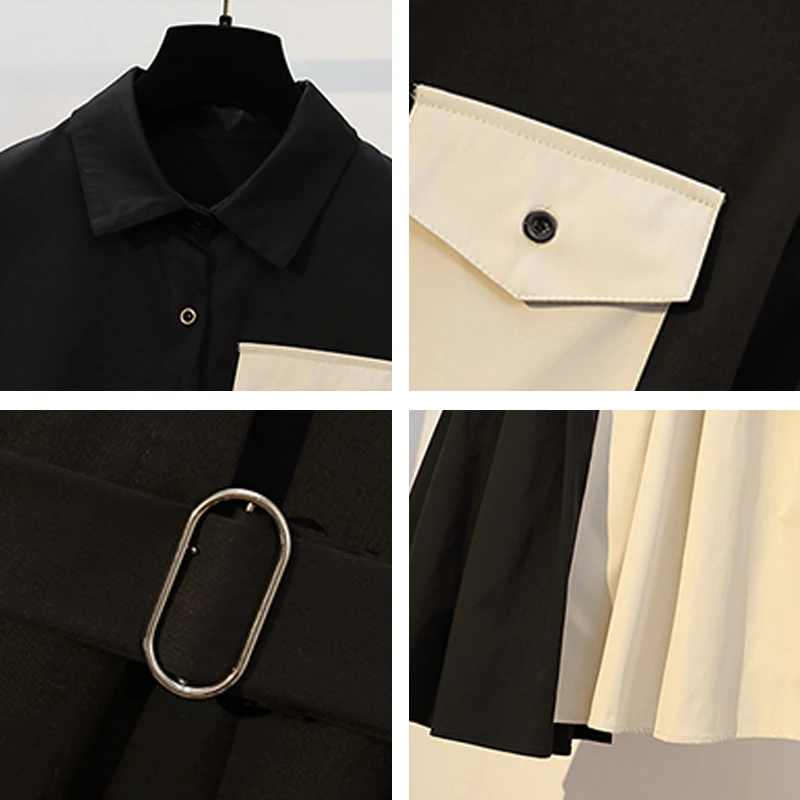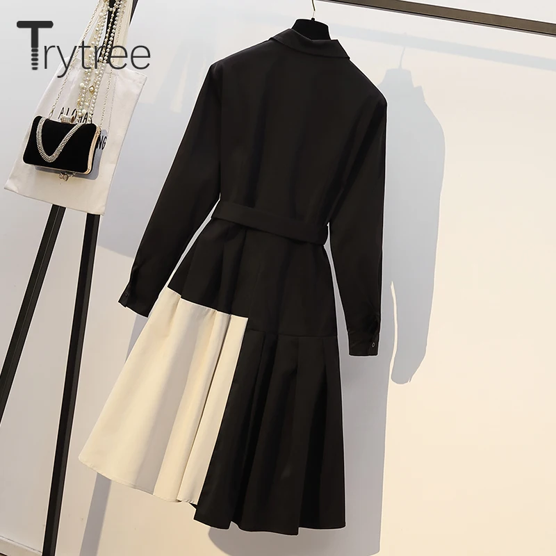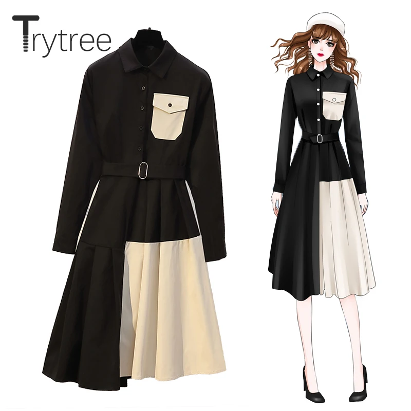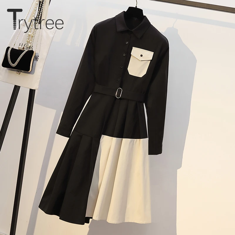 Special Offer Trytree Herfst Winter Casual Vrouw Jurk Turn down Kraag Riem Zakken Patchwork A lijn Abrikoos Zoom Kantoor Dame Shirt Jurk Discount 33% Today!