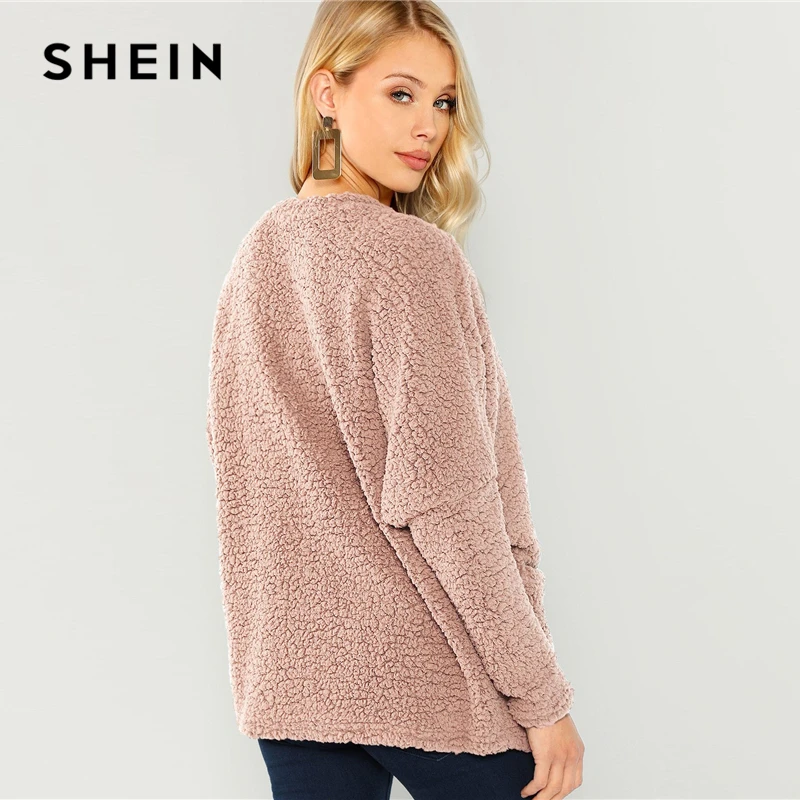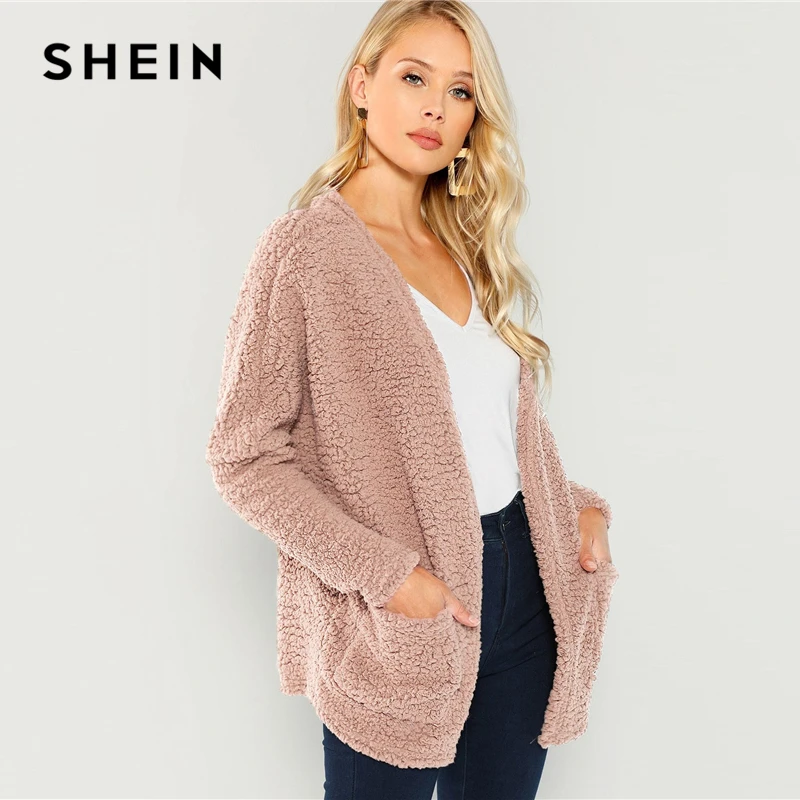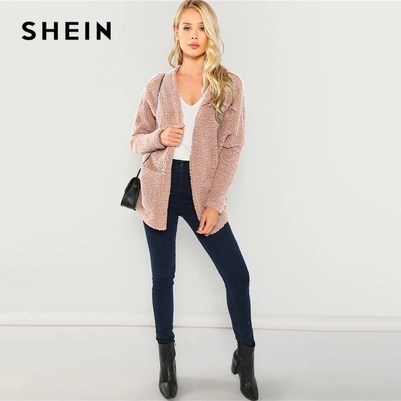 Special Offer SHEIN Roze Patch Zak Open Voorzijde Teddy Jas Plain Lange Mouwen Bovenkleding 2018 Moderne Dame Winter Faux Bontjas vrouwen Jassen Discount 40% Today!