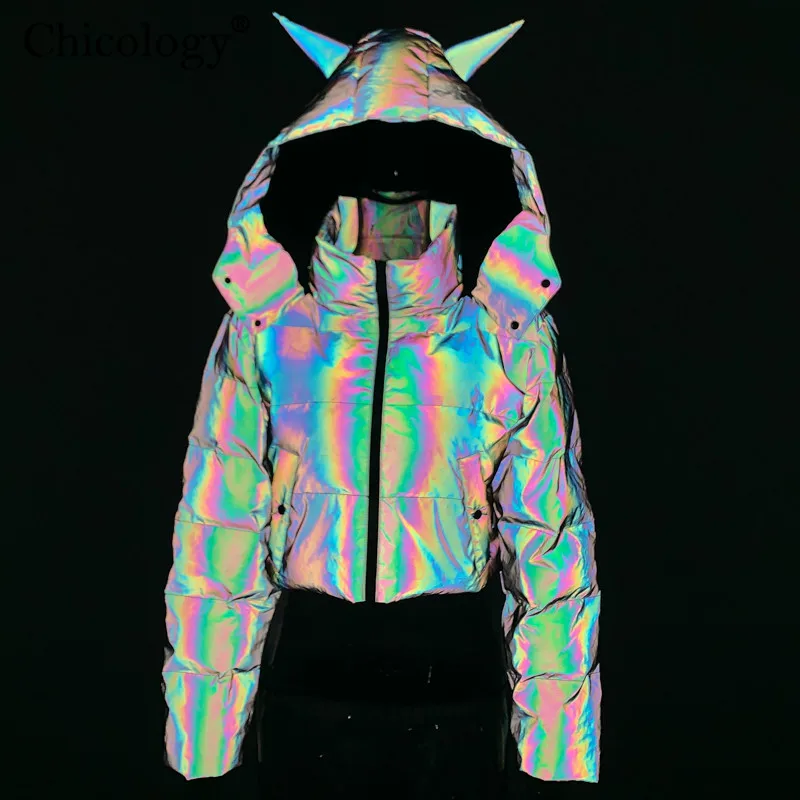 Special Offer Chicology duivel hooded reflecterende katoen gevoerde warme parka vrouwen crop jacket 2019 winter jas met lange mouwen rits bovenkleding Discount 45% Today!