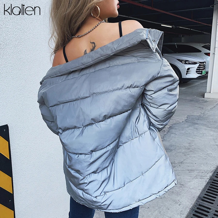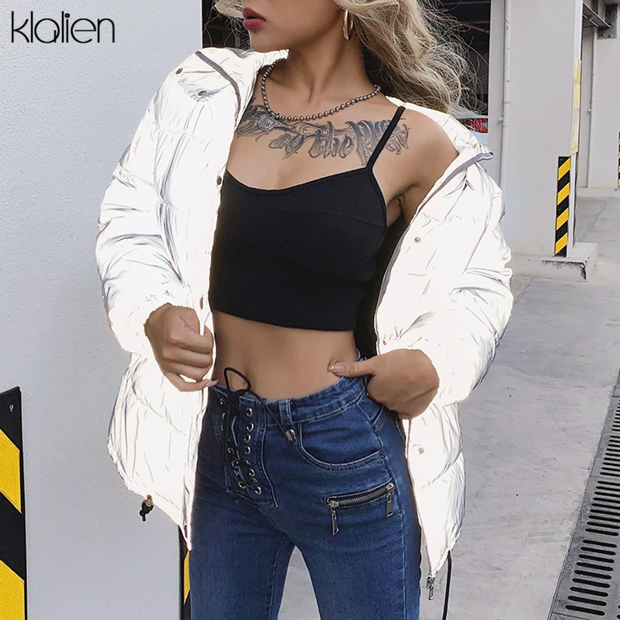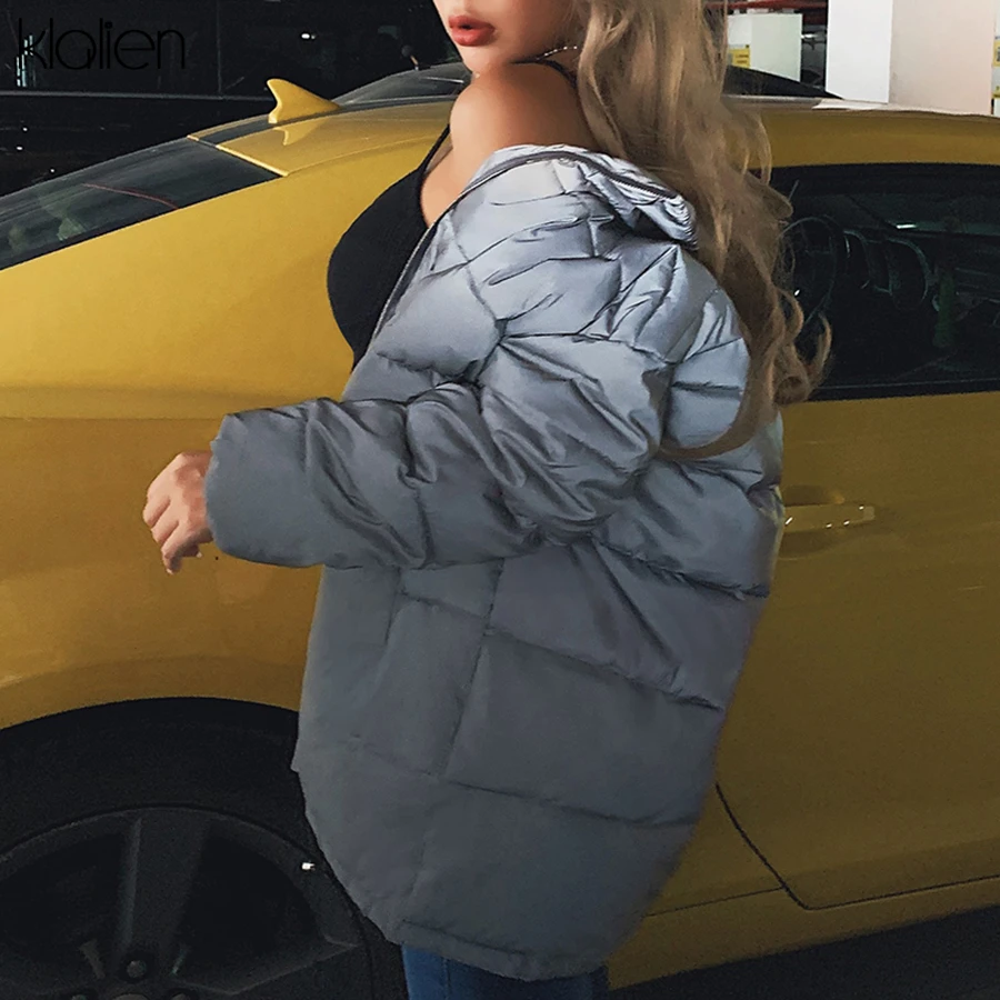 Special Offer KLALIEN Winter Mode Reflecterende Warme lange Jas Womens top Jas 2019 club party Shining losse Bovenkleding Gestreepte brood Jas Discount 50% Today!