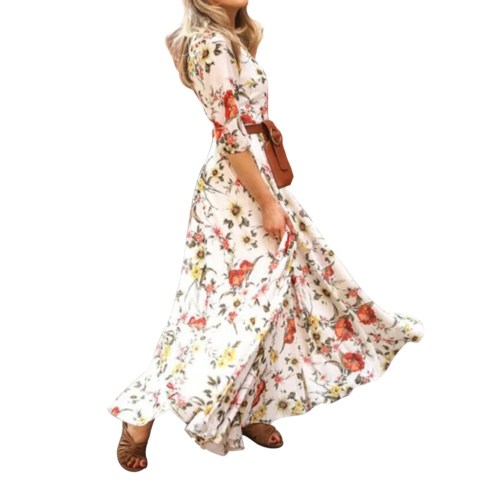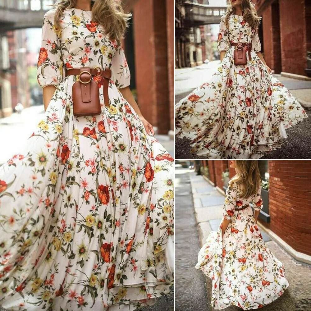 Special Offer Grote Schommel Lange Bloemen Gedrukt Maxi Elegante Fashion Midden Mouwen Cocktail Crew Hals Holiday Vrouwen Jurk Vintage Chiffon Discount 27% Today!