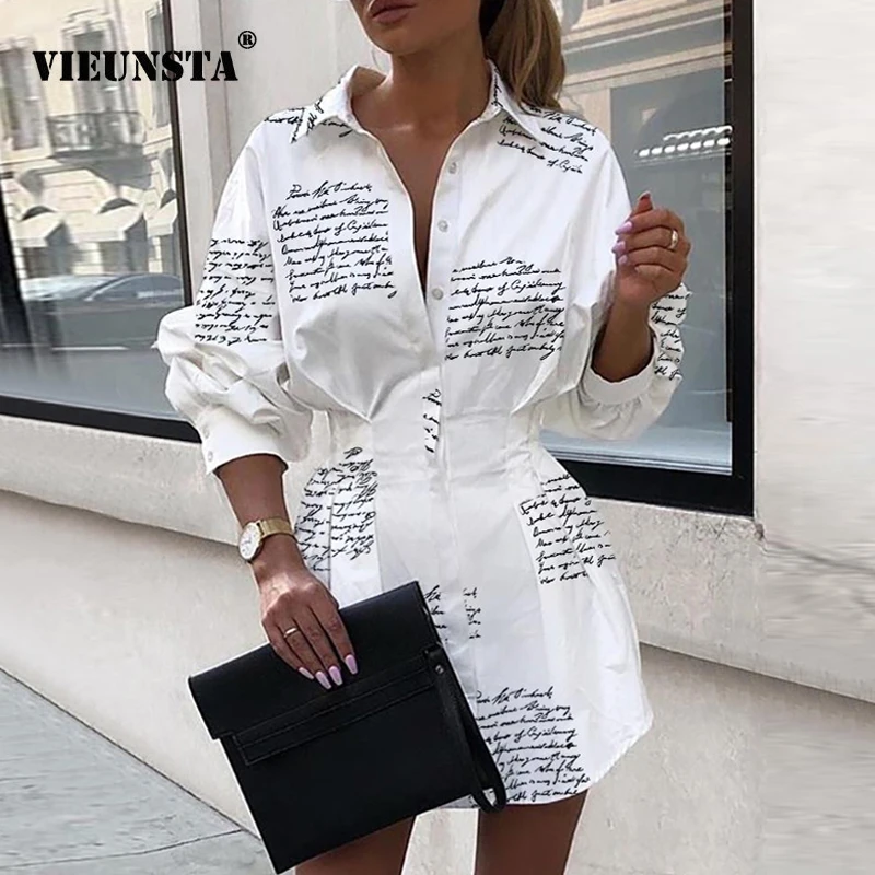 Special Offer Vieunsta 2019 Office Lady Turn Down Kraag Button Shirt Jurk Vrouwen Herfst Lange Mouw Afdrukken Mini Jurk Elegante Sexy party Dress Discount 30% Today!