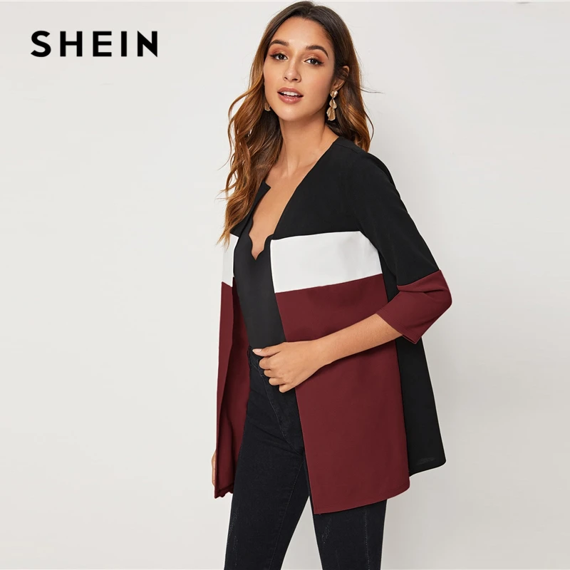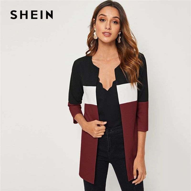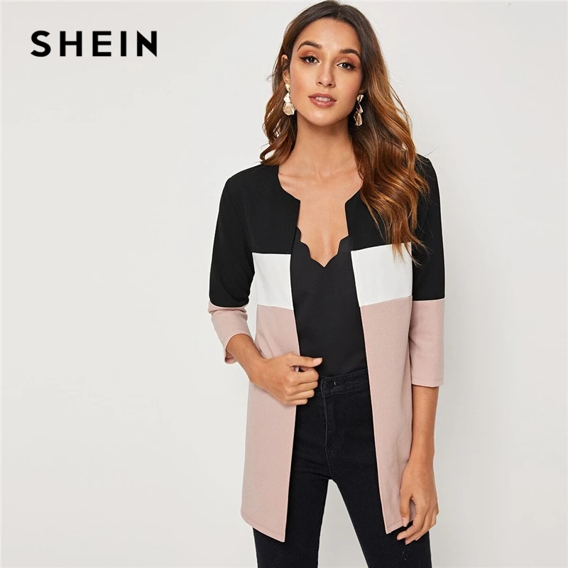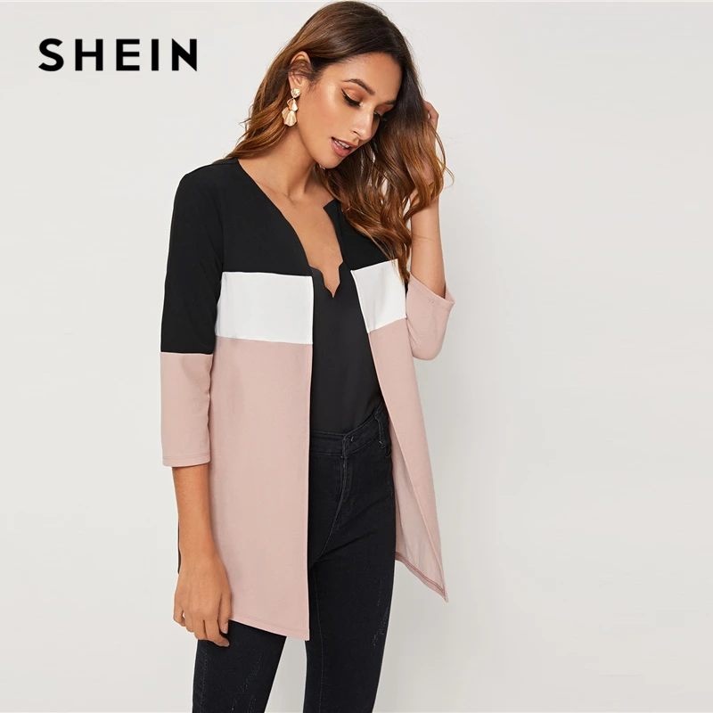 Special Offer SHEIN Colorblock Ronde Hals Knippen En Naaien Open Voorzijde Basic Jas Vrouwen 2019 Herfst 3 4 Lengte Mouw Dames Casual Uitloper jassen Discount 45% Today!