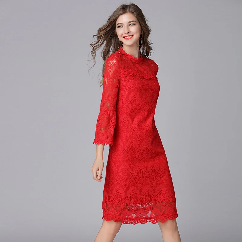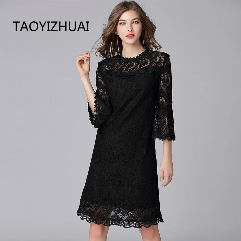 Special Offer TAOYIZHUAI 2019 Herfst Vrouwen Balck Jurk Grote Maat Hollow Out Flare Mouwen Kraag Rits Casual Kanten Jurk Voor Vrouwen 16089 Discount 45% Today!