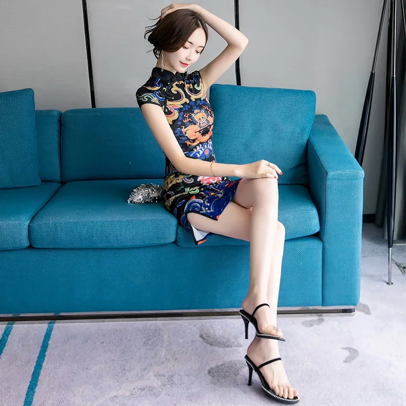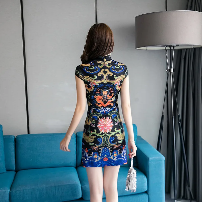 Special Offer Chinese Retro Mode Draak Totem Afdrukken Jurk Mouwloze Split Slanke Cheongsam Jurk Hoge Kraag Korte Mini Sexy Club Jurken Discount 5% Today!