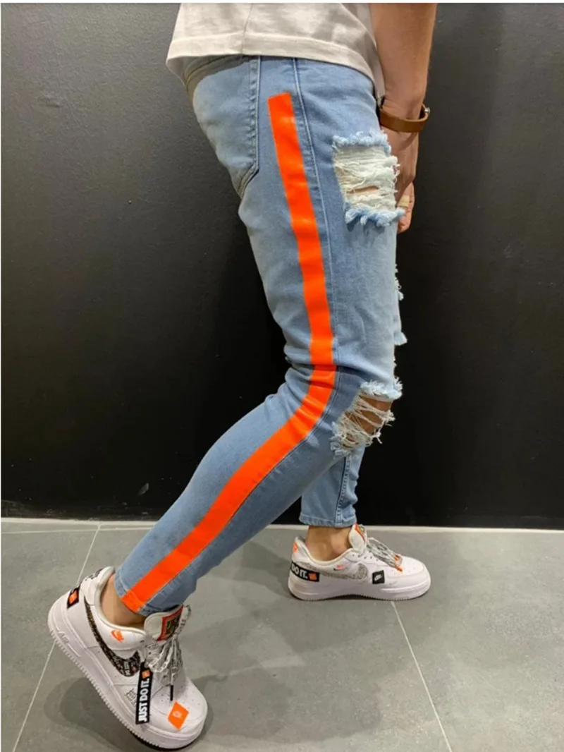 Special Offer Mannen Mode Streetwear Jeans Blauw Kleur Skinny Vernietigd Ripped Streep Jean Gebroken Punk Broek Homme Hip Hop Broek Mannen Discount 0% Today!