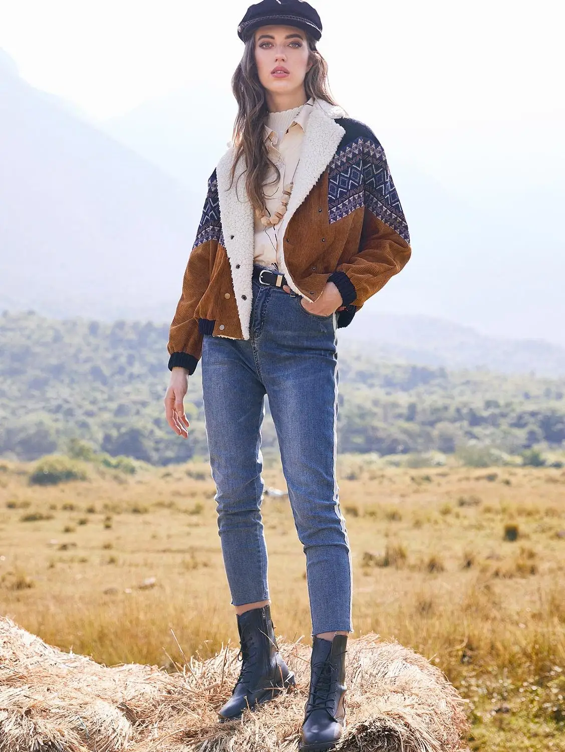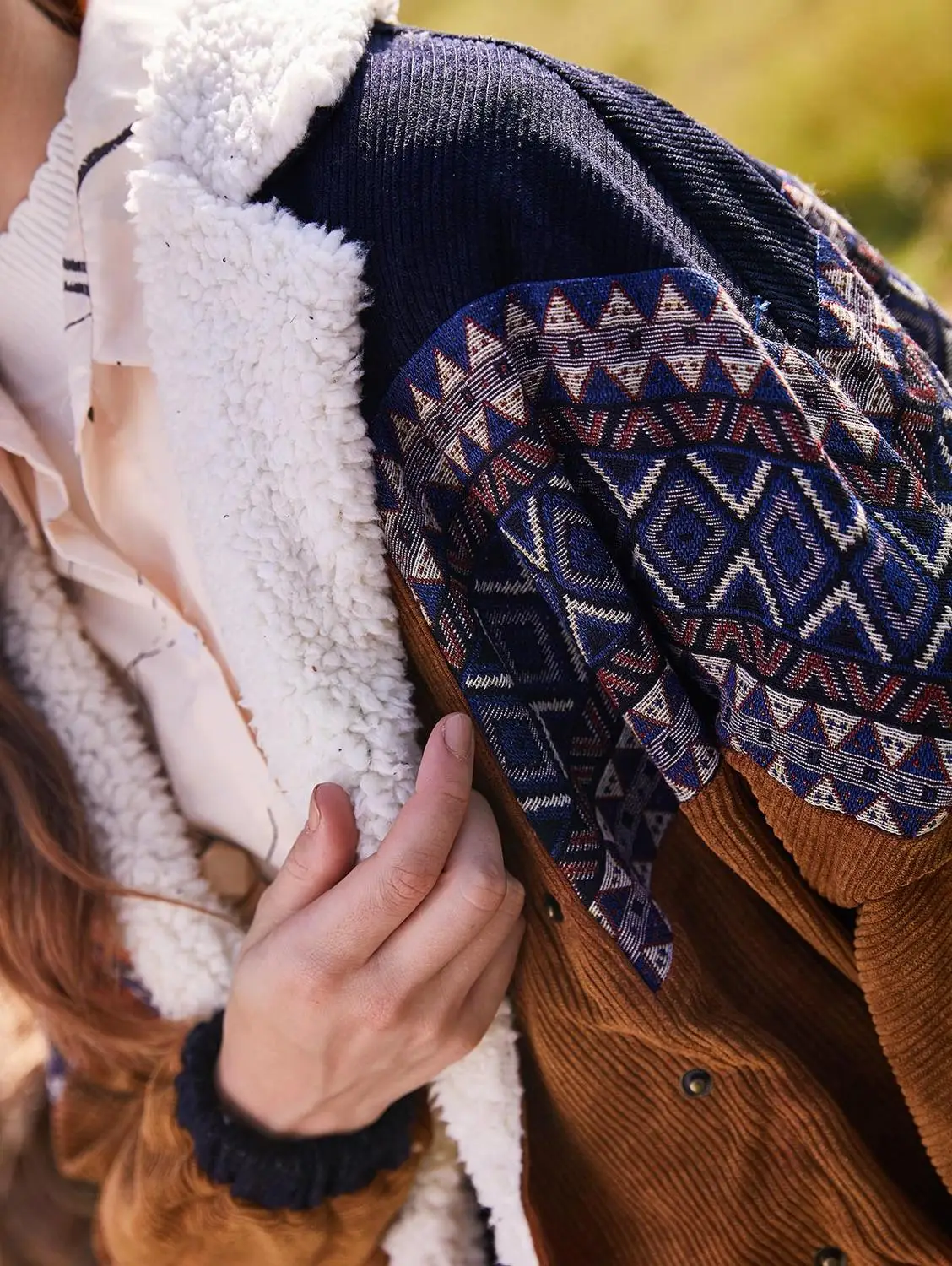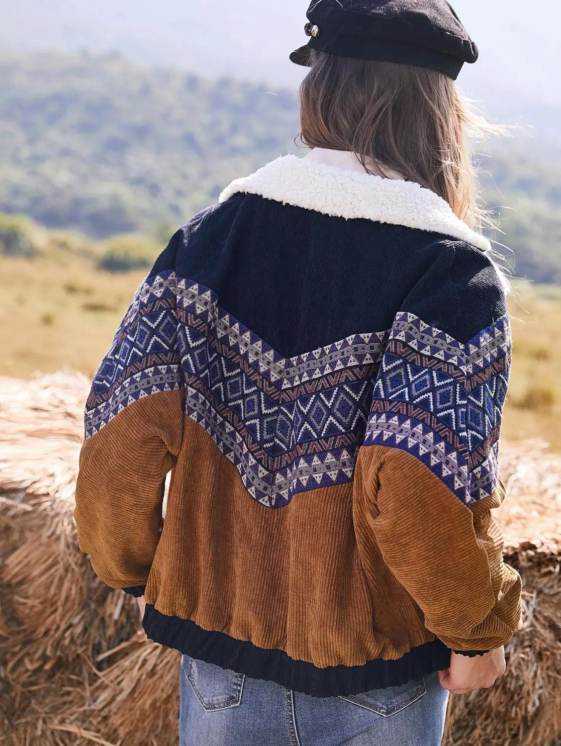 Special Offer Zaful Jacket Jassen Vrouwen Herfst Lente Vintage Uitloper Tuniek Double Breasted Tribal Print Faux Shearling Panel Corduroy Jasje Discount 30% Today!