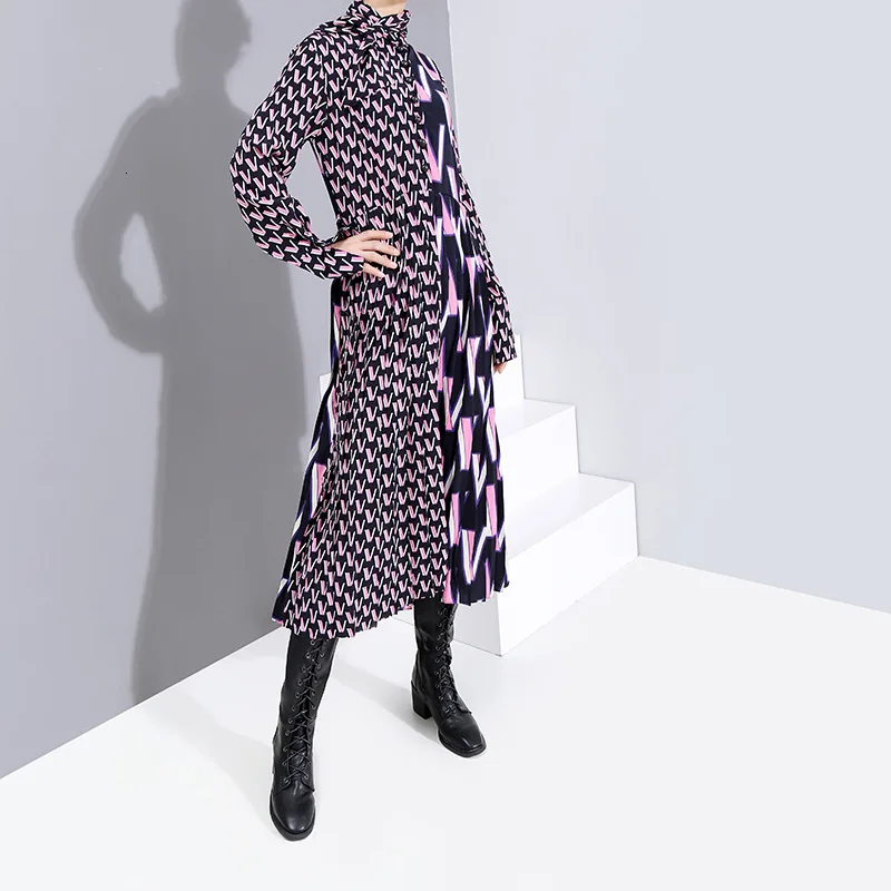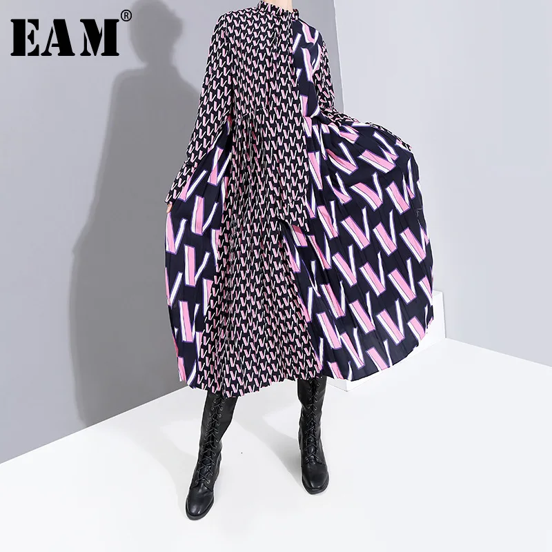 Special Offer [Eam] Vrouwen Patroon Split Temperament Jurk Nieuwe Boog Kraag Lange Mouwen Loose Fit Mode Tij Lente Herfst 2020 19A a872 Discount 32% Today!